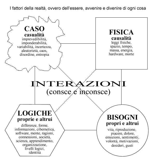 La seguente figura rappresenta i fattori che, secondo me, determinano la realtà di ogni cosa e di ogni essere vivente con particolare riguardo agli esseri dotati di sentimenti e di una mente. L’idea è che tutto ciò che accade nella realtà avviene per una combinazione e interazione di uno o più fattori tra quelli rappresentati nella figura.