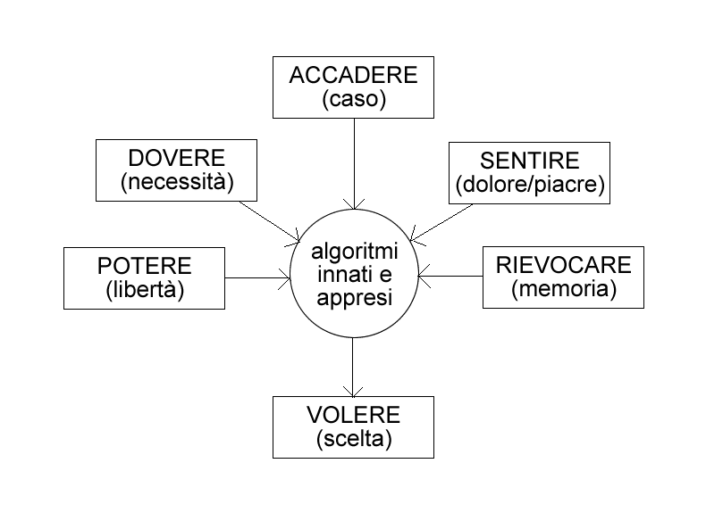 La mente è un sistema che ha come input il potere (cioè la libertà), il dovere (cioè la necessità), l’accadere (cioè il caso), il sentire (cioè il dolore e il piacere) e il rievocare (cioè la memoria), e come output il volere (cioè la scelta). Il suo funzionamento dipende da algoritmi innati e appresi, capaci di modificare se stessi entro certi limiti.