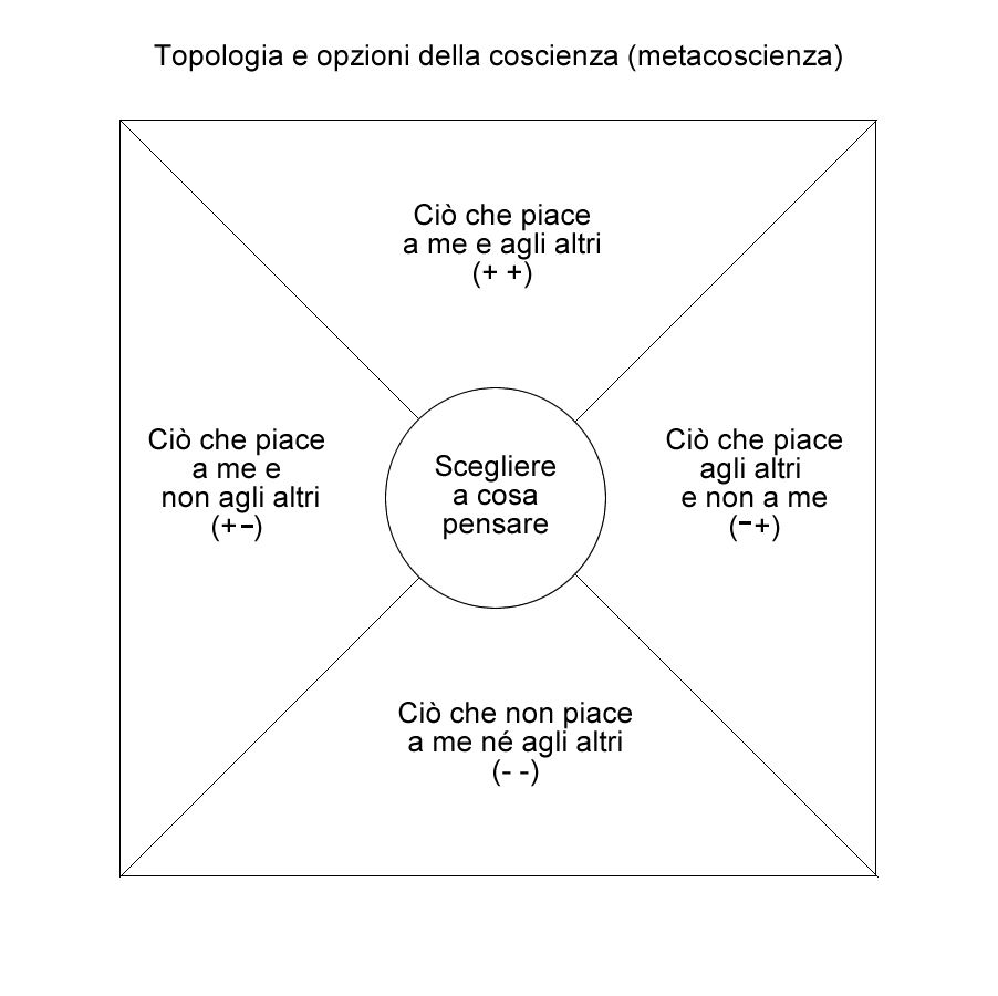 La seguente figura è un esempio di mappa decisionale per la metacoscienza. Essa può essere utile per risolvere i “doppi vincoli” ovvero i conflitti tra motivazioni antitetiche, dove la soddisfazione di una motivazione implica la frustrazione di un’altra.