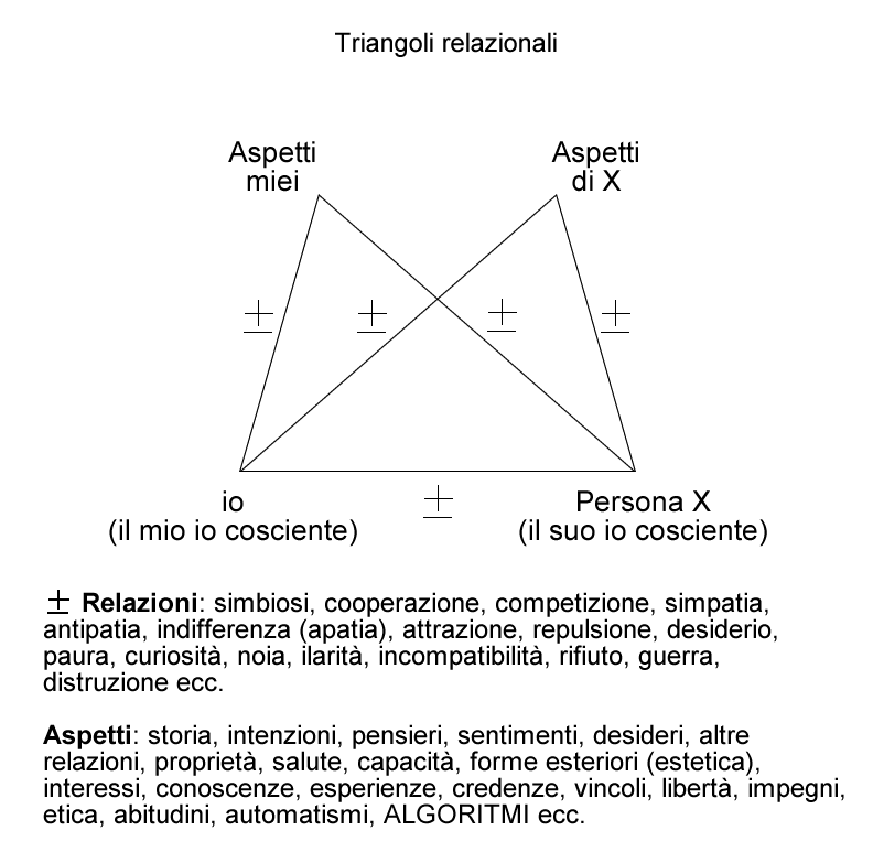 I triangoli nella figura si riferiscono alla teoria dell’equilibrio cognitivo di Fritz Heider, che io preferisco chiamare “teoria dell’equilibrio cognitivo e affettivo” in quanto ha a che fare non solo con pensieri, ma anche con sentimenti consci e inconsci.